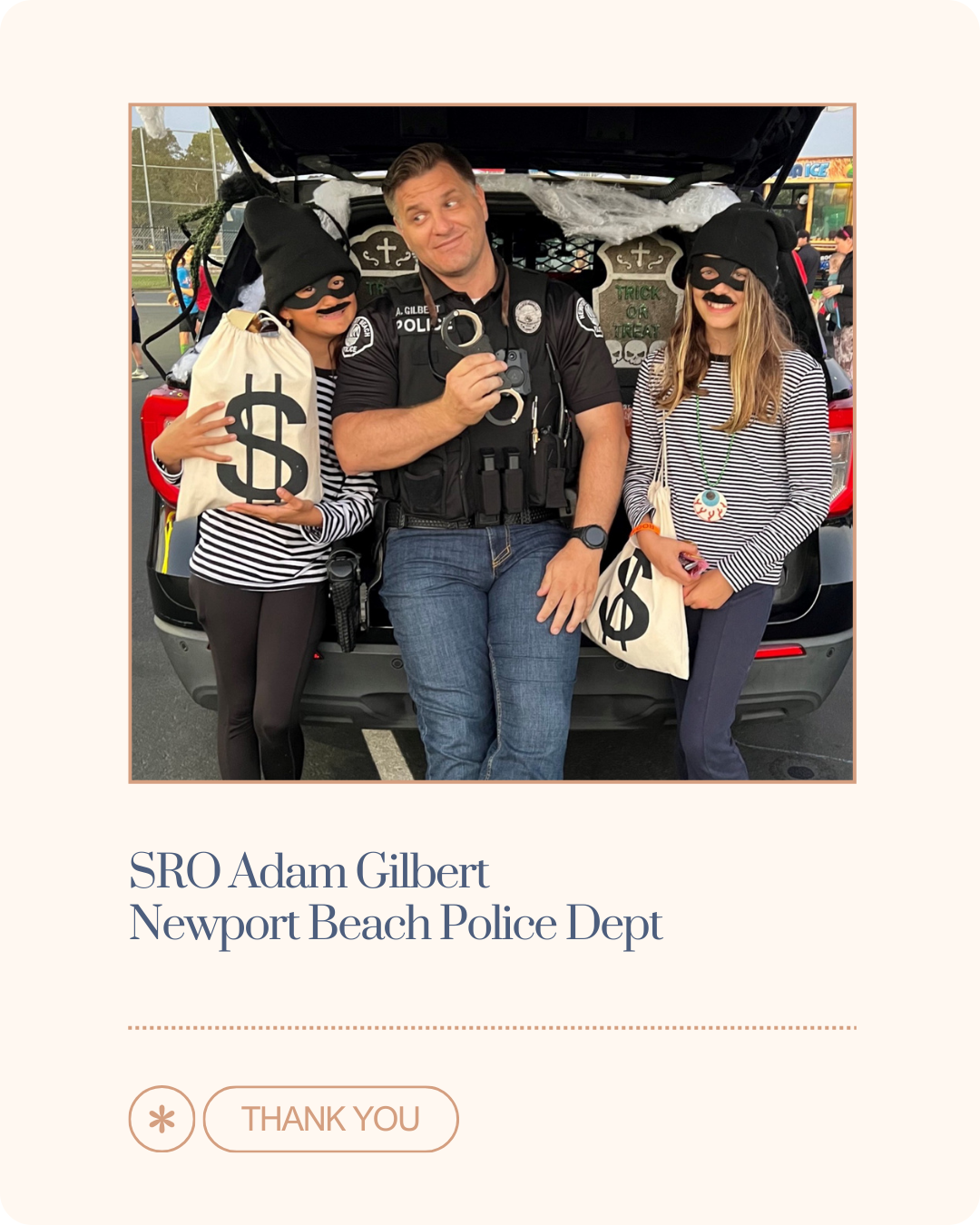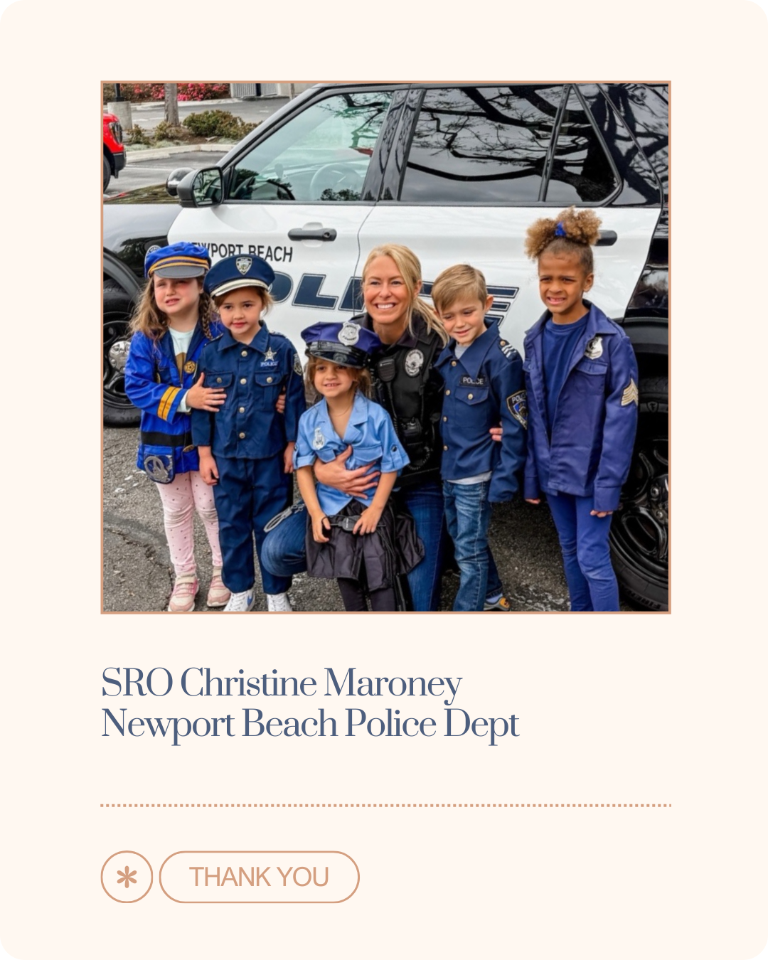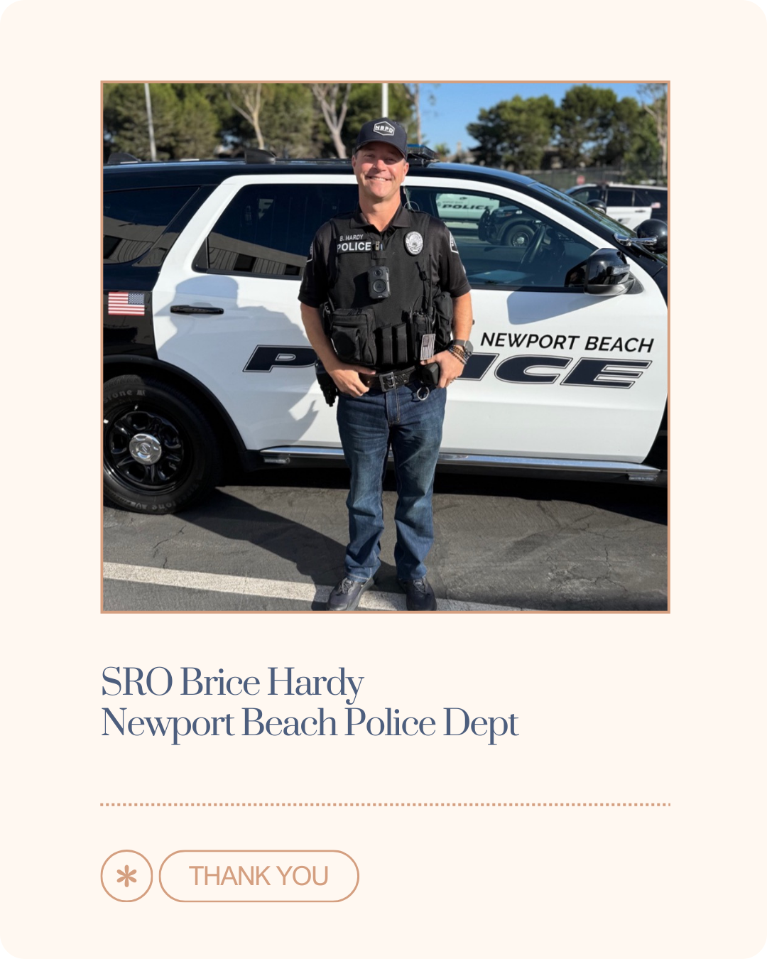 Newport Harbor High School SRO Christine Maroney started interning for NBPD when she was in college 17 years ago. She has always cared deeply about others and had a gift for connecting with people in whatever state they may be. Over the years, she has served as part of the Crisis Negotiation Team, worked patrol on the bike team, and as a Field Training Officer. After becoming a mom, she realized how much she enjoys working with kids, and that she has the patience to really support them (which I’m guessing her part-time yoga instructor gig helps with!). She shares that – while she doesn’t love wearing jeans on the job – she does love being part of the supportive campus environment; “the Newport community truly values its officers, and that appreciation is felt even more in our schools.”  At home, she has two little boys of her own whom she plans adventures with, whether camping, backpacking, being in the mountains, or simply going somewhere new.