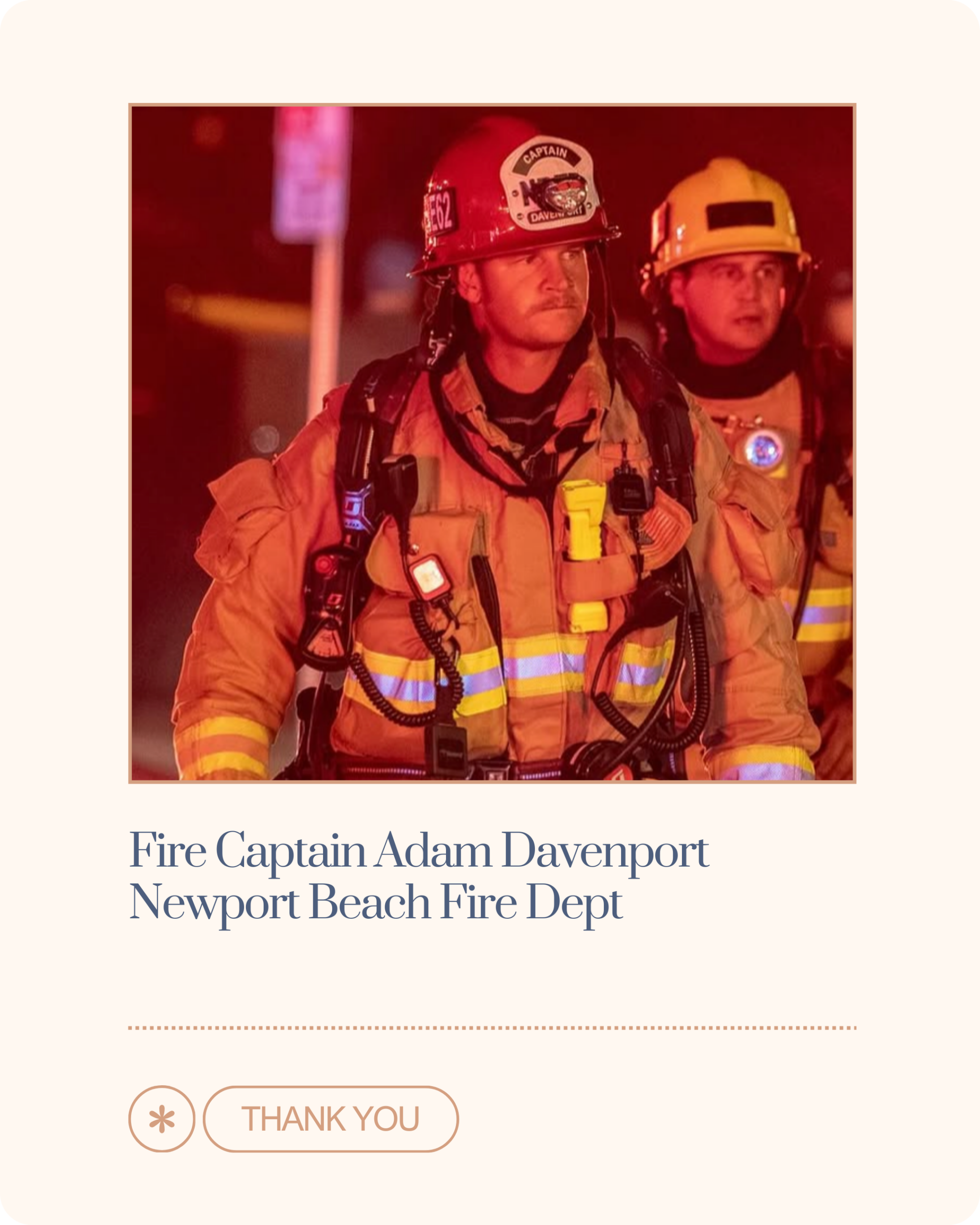Fire Captain Adam Davenport has worked for NBFD for 20 years. His career was inspired by an incident, when he was in high school, that led to fire department response. He recalls how the firefighters made a bad situation better and checked on him for months afterward, leaving him wanting to make a difference in people’s lives too.