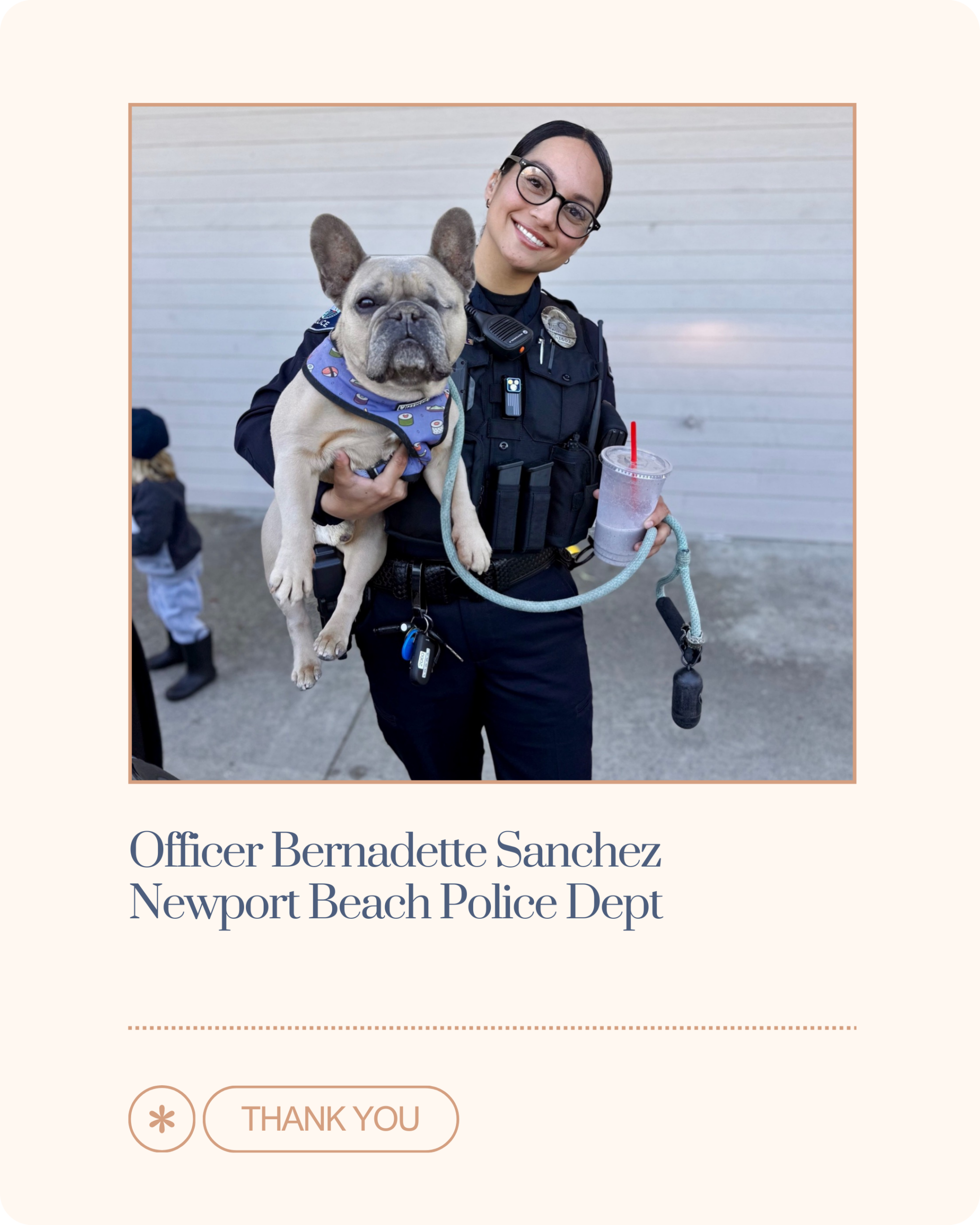 Here in Newport, Sanchez is currently assigned to Patrol as a Field Training Officer, and serves as a K9 Agitator, Firearms Instructor, member of the Department Recruiting Team and has already earned the Life Saving Award. After policing in a large metropolitan city, she was surprised by how many people wave, smile, or stop to say hello during shift- community engagement (and the ocean views!) making a tough job a little easier. In her off-time, she blows off steam getting outside with her two bulldogs, MooMoo and Sullivan.
